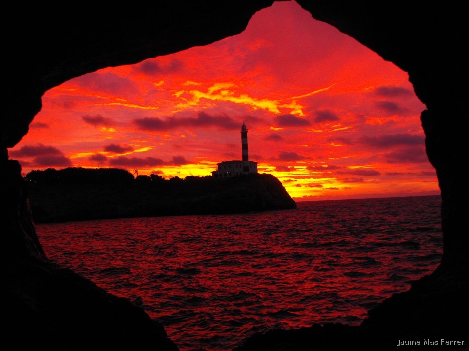 Amanecer desde Sa Cova Foradada en Portocolom, el faro al fondo, dia 21-12-2010.